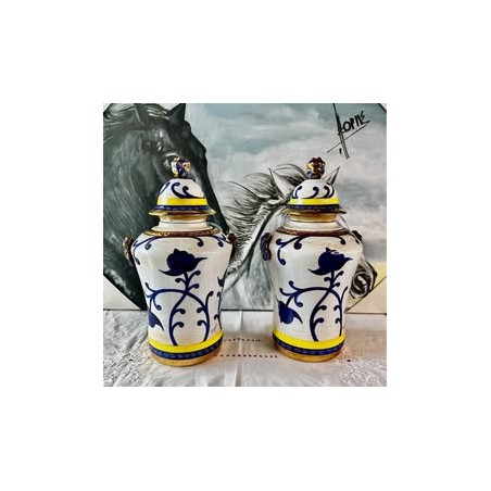 Par de potes c/ tampa em porcelana , pintadas a mão e assinadas.